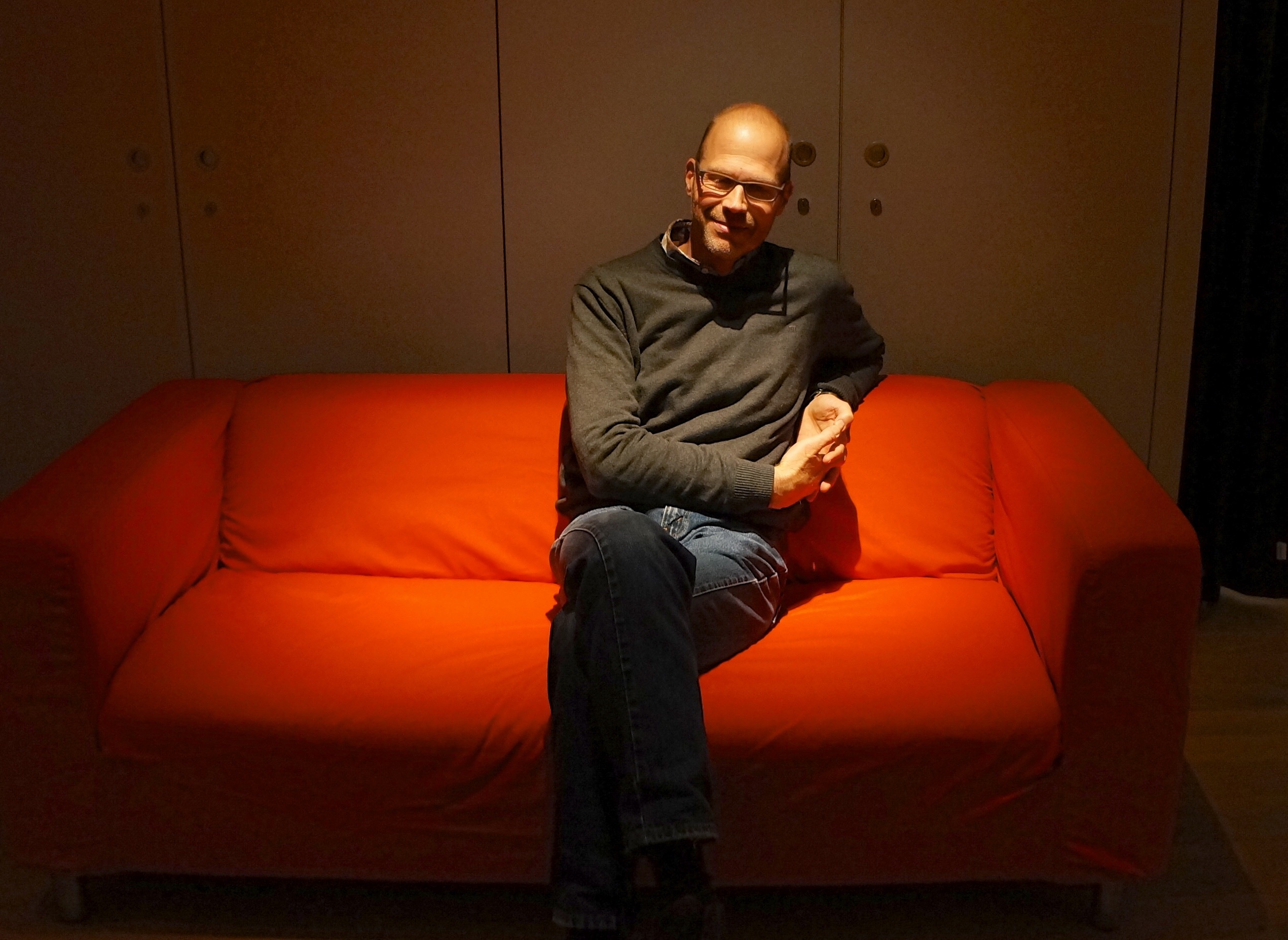 Allein auf dem rotem Sofa: Museumsdirektor Hannes Geisser.