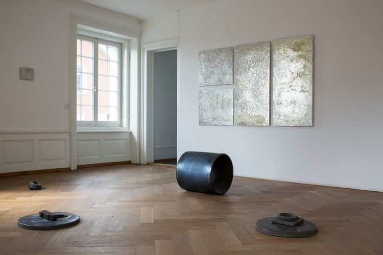 Vier Zinnreliefs aus der Serie "Potentielle Normaliensammlung", 2017, von Reto Müller (*1984 in Stein am Rhein), lebt und arbeitet in Buch bei Uesslingen. Dazu heisst es: «Die Ankaufskommission des Beirats erwirbt von Reto Müller ein vierteiliges Zinnrelief aus der Werkgruppe der "Potentiellen Normaliensammlung". Unter diesem Titel entwickelte der in Buch bei Uessligen arbeitende Plastiker im Verlauf der letzten Jahre eine Serie von Arbeiten, in der er Gestaltungsmodelle der Moderne untersucht und hinterfragt. Die Theoretiker der Moderne gingen unter anderem davon aus, dass Materialgerechtigkeit, Funktionalität oder auch die Klarheit der Geometrie zwangsläufig zur "guten Form" führen müssten. Ausgehend von diesem Grundgedanken gestaltet Reto Müller aus Beton, Zinn oder gegossenem Basalt plastische Elemente und Reliefs, in denen er Erstarrungsprozesse und Normierung erprobt. Seine Befragungen des Modellhaften und Modularen führt allerdings zu irritierenden Objekten, die durch ihre Ambivalenz zwischen Relief, Skulptur und Bild die Modelle der Wahrnehmung nachhaltig irritieren.» Bild: Kunstmuseum Thurgau