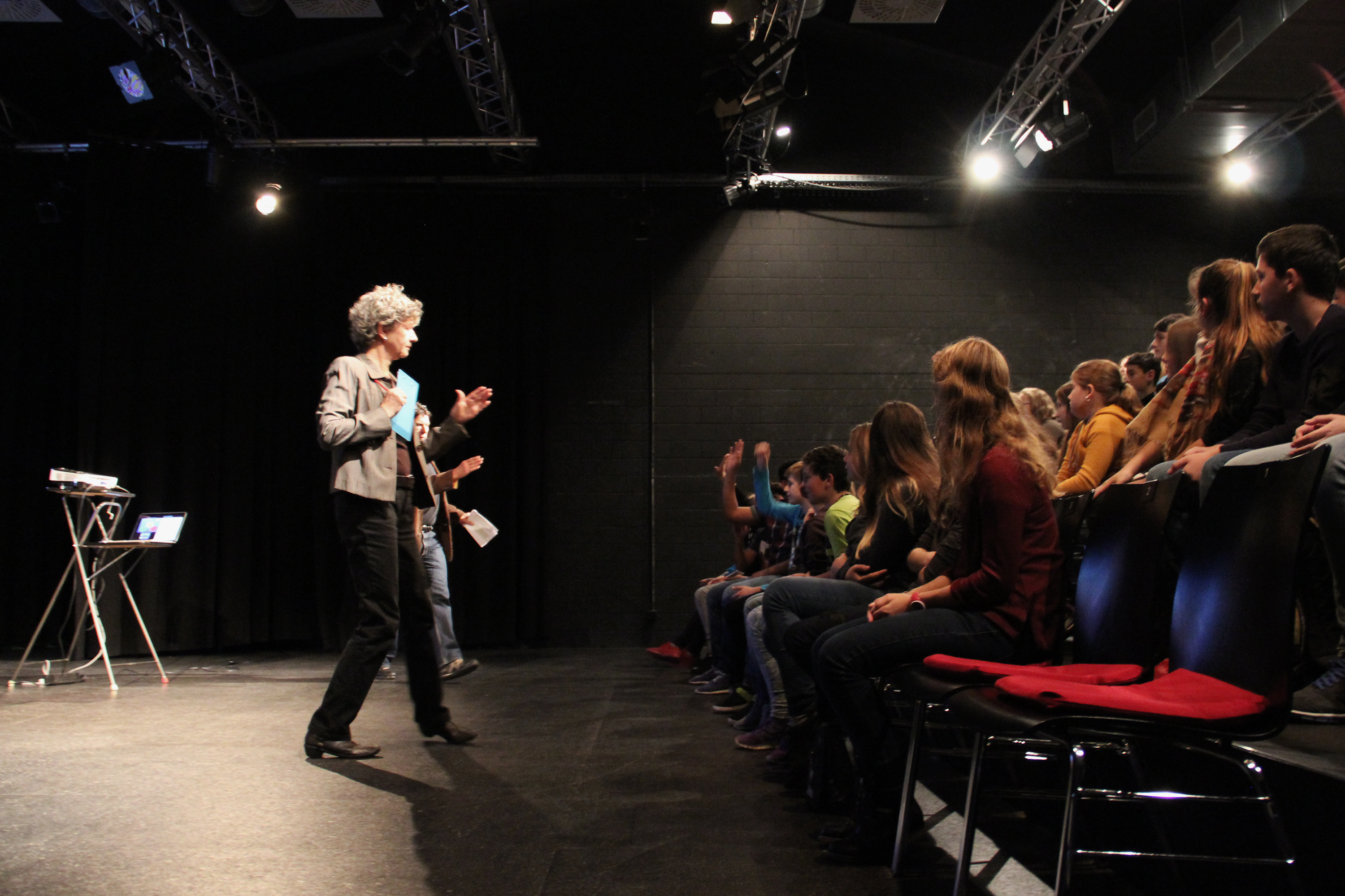 Und das scheint zu funktionieren: Die Schülerinnen und Schüler beteiligen sich an der Diskussion und eifern mit, wenn ein Kollege von ihnen vorne auf der Bühne vorspielt, wie man mit rauchenden Eltern umgehen könnte. Und nach dem Stück, während einzelne Schüler auf dem iPad ihr Gesicht künstlich altern lassen, teilen andere ihre Raucher-Geschichten (das heisst: die ihrer Familie) mit den Schauspielern.