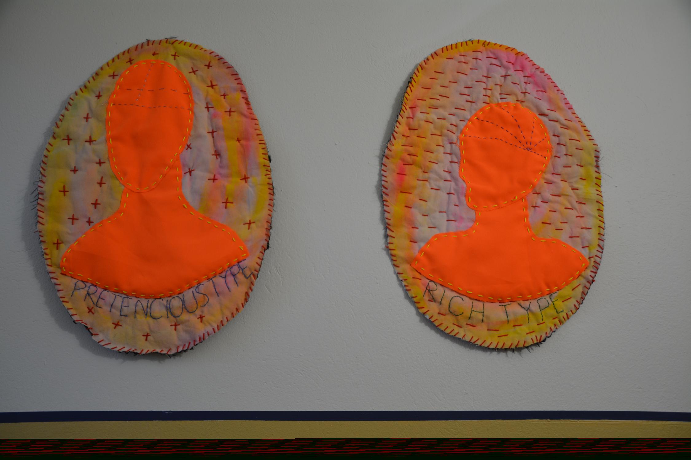 Unsichtbar unter einer Maske oder etwas Bedrohliches, potenziell Ansteckendes. Rot wie die Liebe, rot wie die Gefahr. Auch eine textile Zunge, die auf einem Heizkörper ruht, wie eine Schlange in der Sonne, ist bespickt mit Nieten. Nicht die scharfe, eher die stachlige Zunge. Sprachwitz und Symbolik tauchen bei Timashkova immer wieder auf.