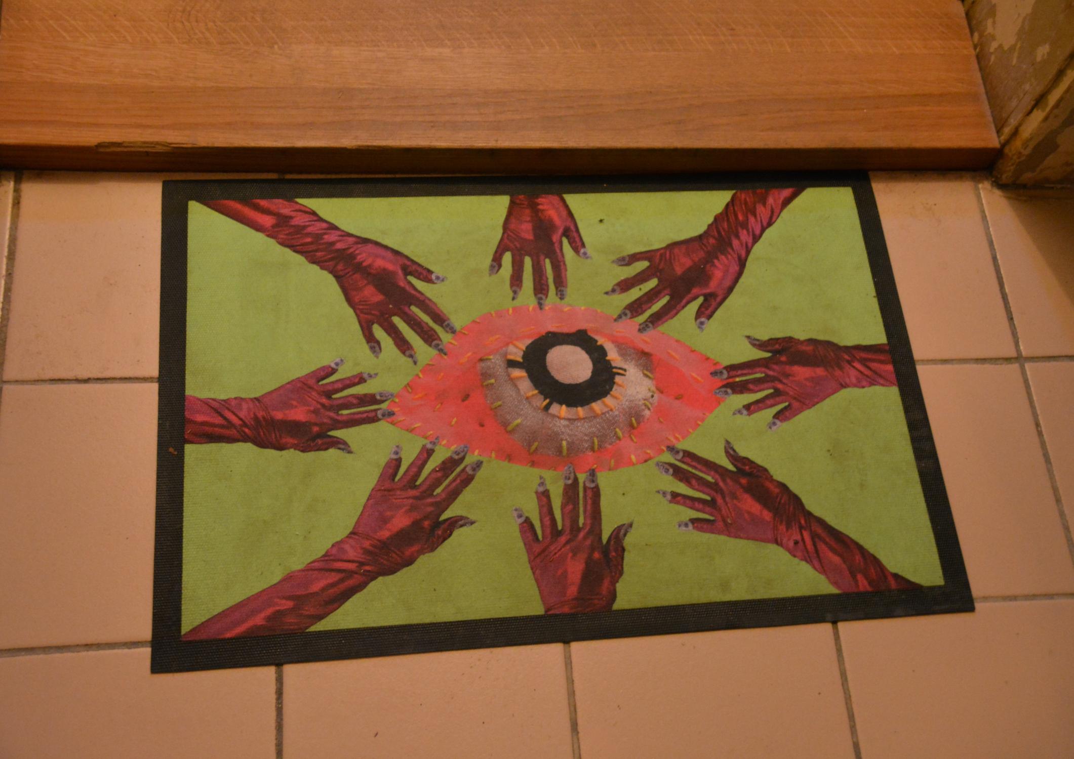 Sie wirft aber auch die Frage auf: „Was ist Kunst? Wo ist die Grenze zwischen Kleidungsstück und Kunstwerk? Ist ein überdimensioniertes Stoffauge Kunst oder Dekoration? Wann wird ein Objekt zum Kunstwerk? Ist die Fotografie von Kunstwerken auf einem Schuhabstreifer Kunst oder nur ein Abbild davon? So wie René Magritte in „Der Verrat der Bilder“ zu bedenken gab: „Ceci n´est pas une pipe.“ Was ist die Realität eines Objekts? Und konkret: Darf ich auf den Schuhabstreifer drauftreten?