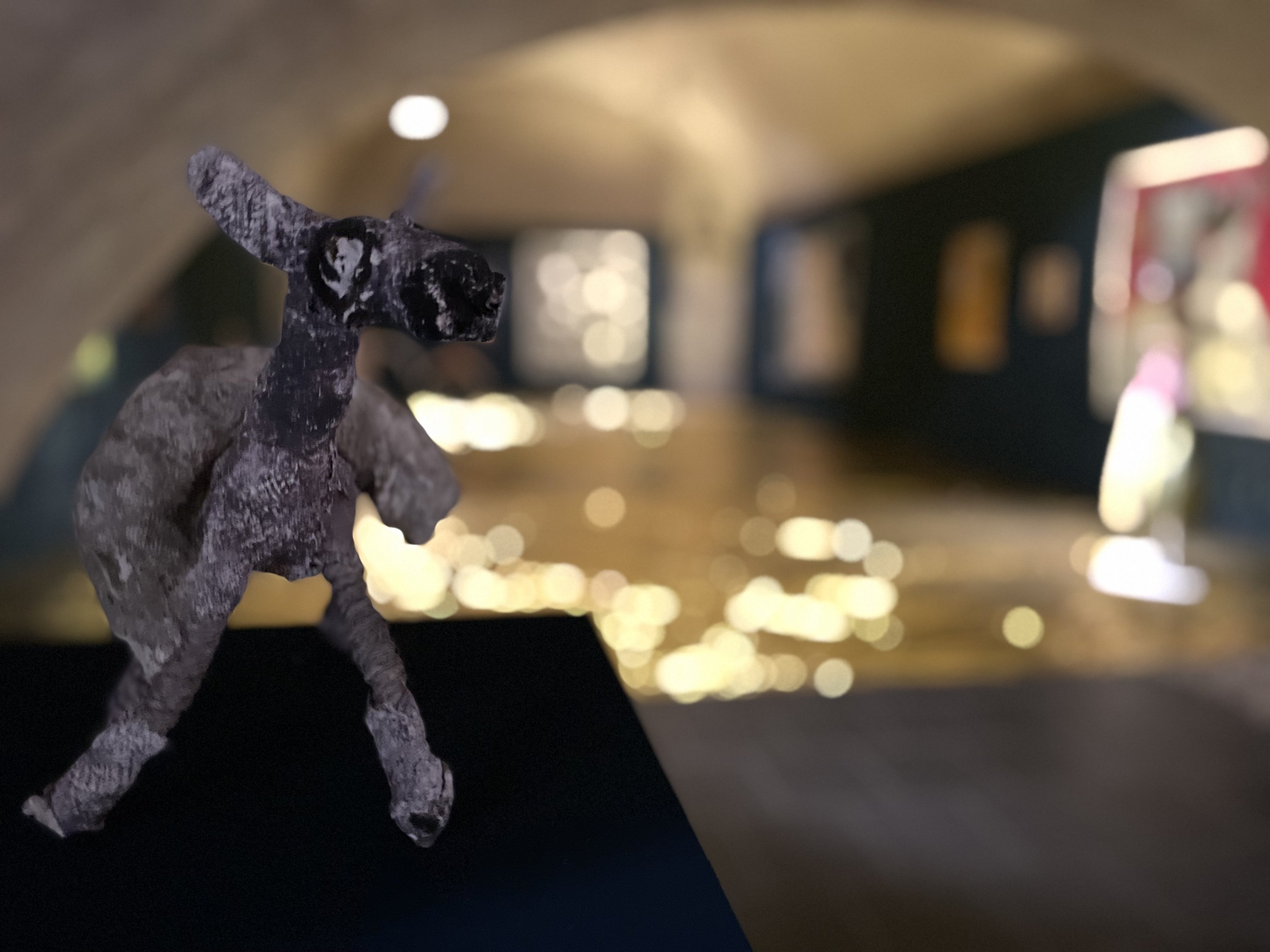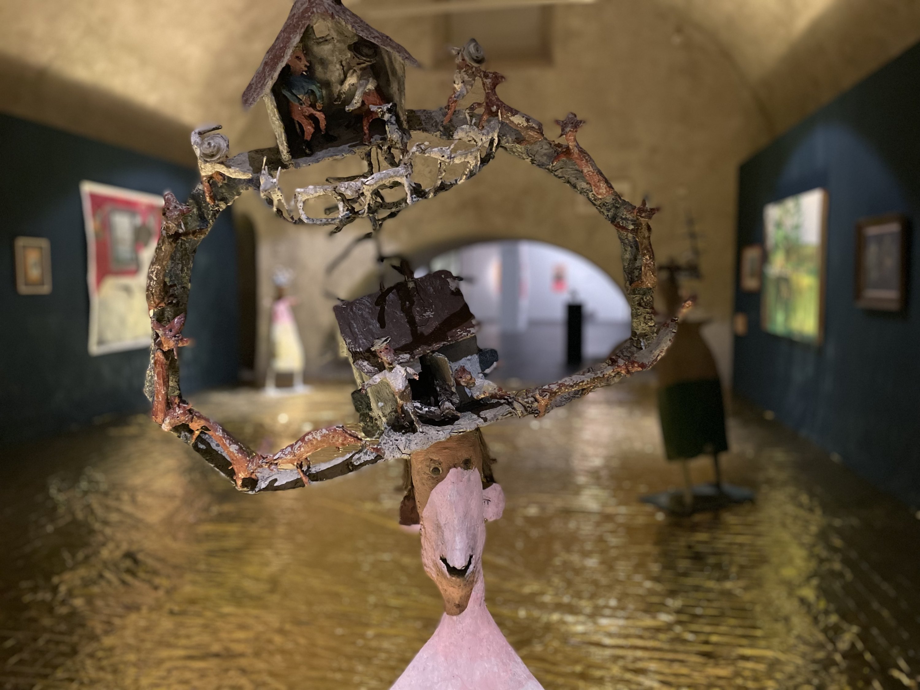 Im Gewölbekeller treffen installative Arbeiten (Ulrich Bleiker und Jaber al Mahjoub) auf Malerei, Textilkunst und Aquarelle. Lichtinszenierung, Raumgestaltung, Komposition der Bilder - Kuratorin Stefanie Hoch hat in diesem Raum eine besondere Atmosphäre geschaffen, die man schwer fassen kann. Es ist irgendwas zwischen irritierend und berührend. Als Besucher:in bleibt man in diesem Raum immer unter Spannung, weil man nie weiss, ob die schrägen Figuren von Ulrich Bleiker nicht doch noch anfangen sich zu bewegen.