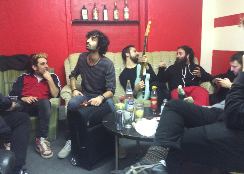 Mitglieder der beiden Bands auf der Couch. Zweiter von links Kamyar, Gitarrist von Langtunes. In der Mitte mit Gitarre, Amit Peled, Gitarrist von Ranzailech. (Bilder: Philipp Bürkler)