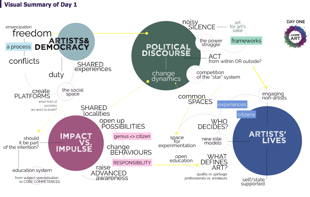 In Nachtschichten visualisierte ein Team aus Technikerinnen und Künstlern die jeweiligen Diskussionen und Konferenztage, wie hier im Bild die Mittwochs-Zusammenfassung. (Screenshot: jammart.eu)