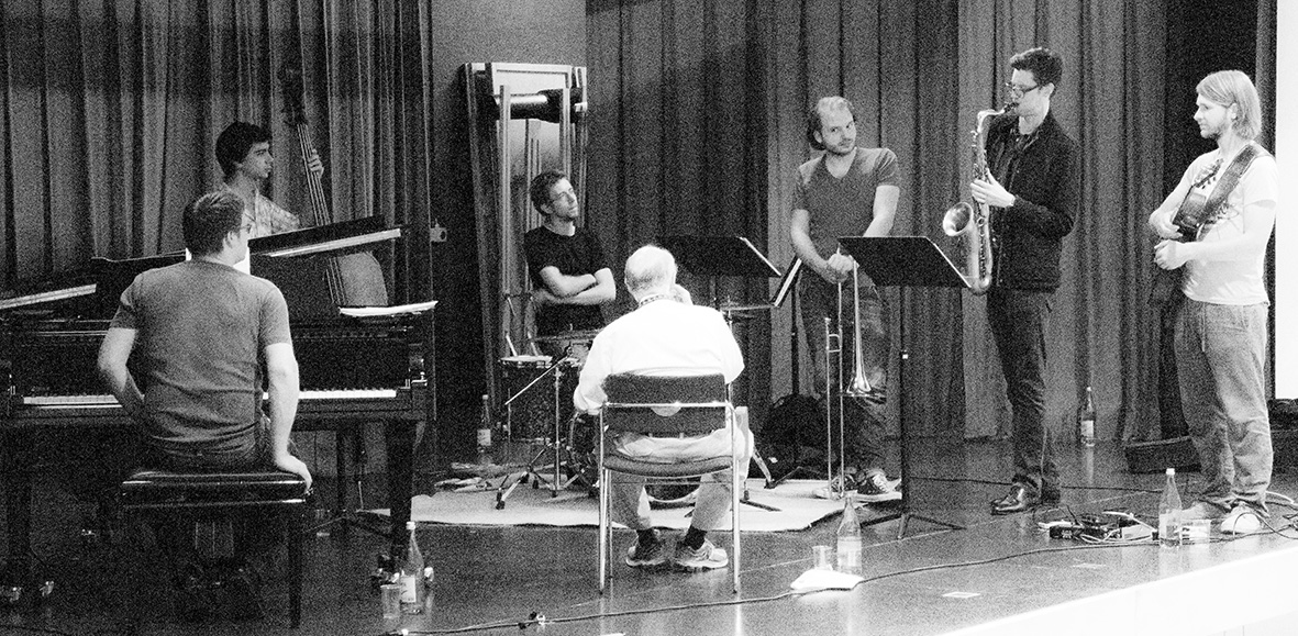 Im Vordergrund der Workshops stehen die Gestaltung der Tunes, das Zusammenspiel, die Aufteilung auf die Instrumentenstimmen, die Kommunikation auf der Bühne und wichtige Tipps aus erster Hand. Dabei gehen die Masterclass-Lehrer Seamus Blake (ts), Adrian Mears (tb), Don Friedman (p) und Lewis Nash (dr) ganz individuell vor. „Das Klima ist sehr gut. Und ich kann viel profitieren“, meint Vogelsang. „Weisst du, das ist ein schwieriger Job. Jeder hat seine Vorstellungen, was und wie man spielen könnte.“ Darüber hinaus geniesst Jonas den Kontakt mit den arrivierten Profis: „Don hat uns Anekdoten aus dem New York der 50er-Jahre erzählt.“