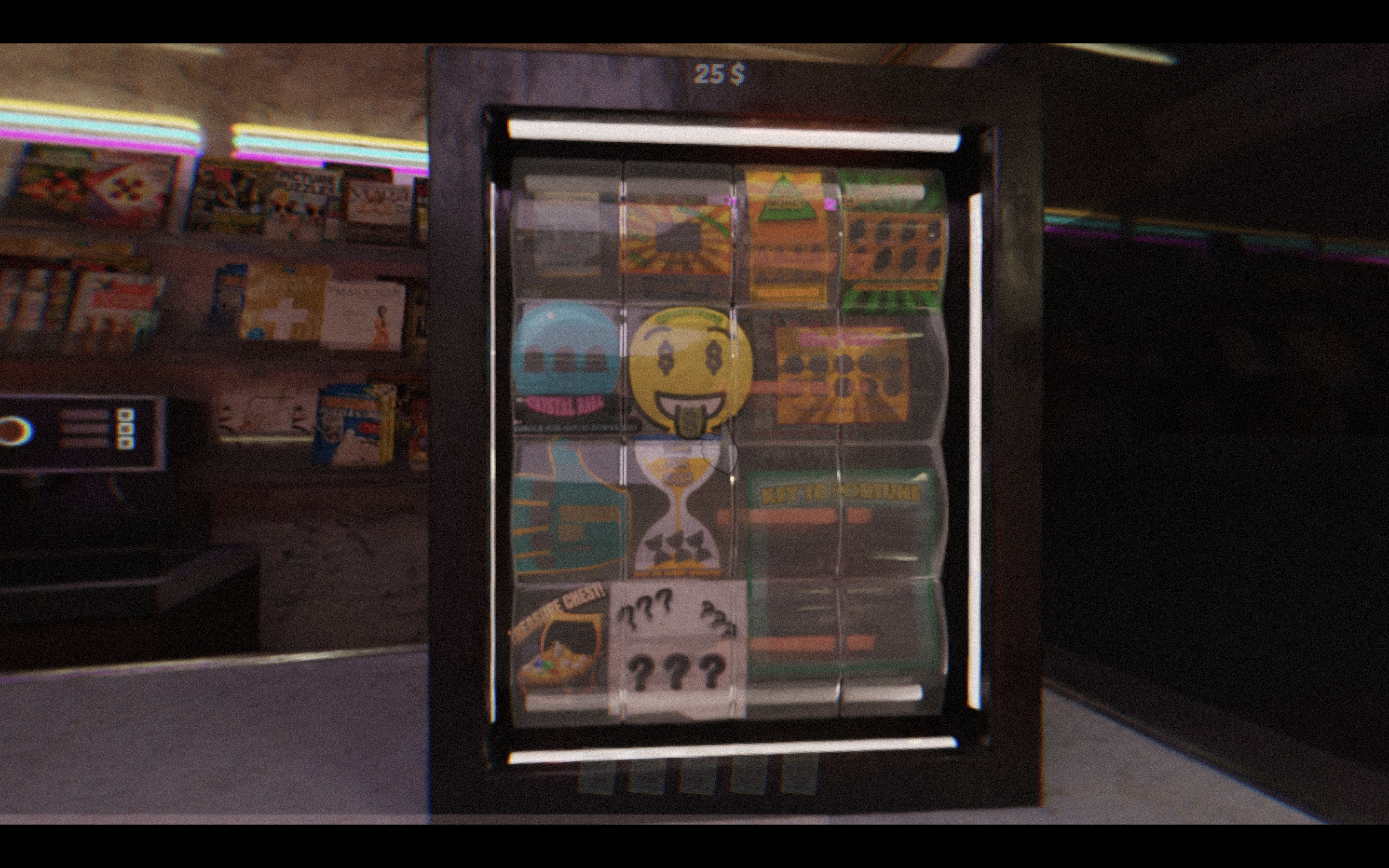 „Grubby Fingers“ offenbart uns nach ein wenig Erkunden vier mögliche Handlungsmanöver: Da ist ein Kühlschrank voll mit Energydrinks, in die wir unsere 20 Dollar Startkapital investieren können, ein Radio, welches wir anwerfen dürfen, ein Schaukasten mit zahlreichen Rubbellosen und ein passender Tisch zum energetisch Freirubbeln.