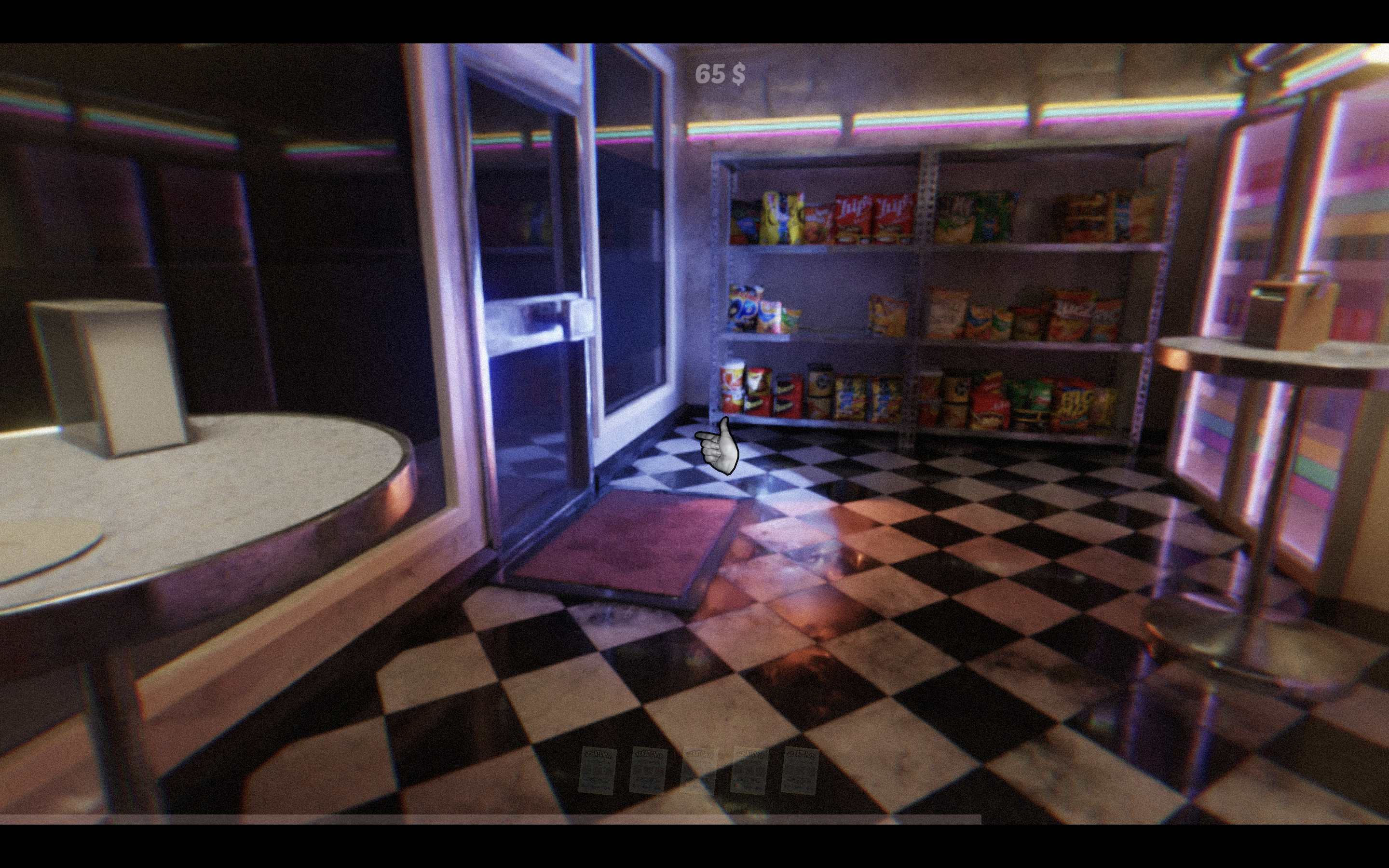 „Grubby Fingers“ ist keinesfalls eine seichte Fingerübung, sondern ein komplexes, vielschichtiges Spielerlebnis, das seine Spieler und Spielerinnen auf vielfältige Arten und Weisen stimuliert und herausfordert. Zuerst ist da die ansprechende Optik: Wir befinden uns in einer in Neonfarben ausgeleuchteten Raststätte, deren dezent mysteriöser Look unheimlich zur Atmosphäre beiträgt. Per klassischer Point-and-Click-Steuerung manövrieren wir uns durch zielgerichtete Mausklicks durch diesen Mikrokosmos.