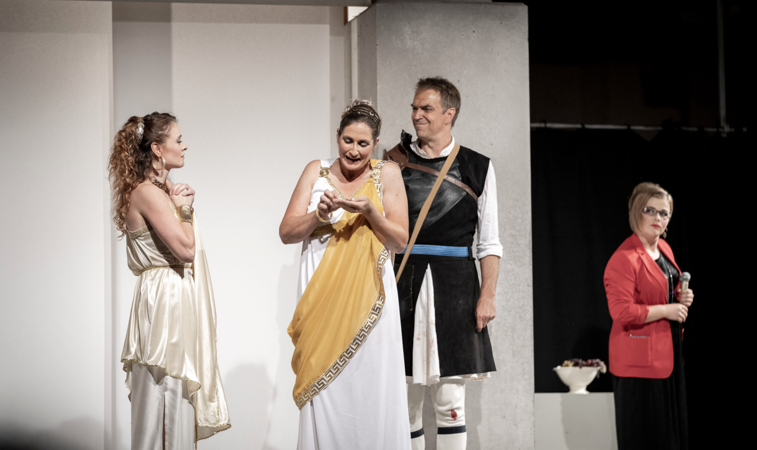 Als der echte Amphitryon (Marcel Zehnder) also von Alkmene (Regina Nonna Fink) vorgeschwärmt bekommt, wie heiss die Nacht zuvor mit ihm war, obwohl er ja im Krieg war, geht es natürlich rund: Anschuldigungen, Eifersucht, Gegenvorwürfe, solche Sachen.