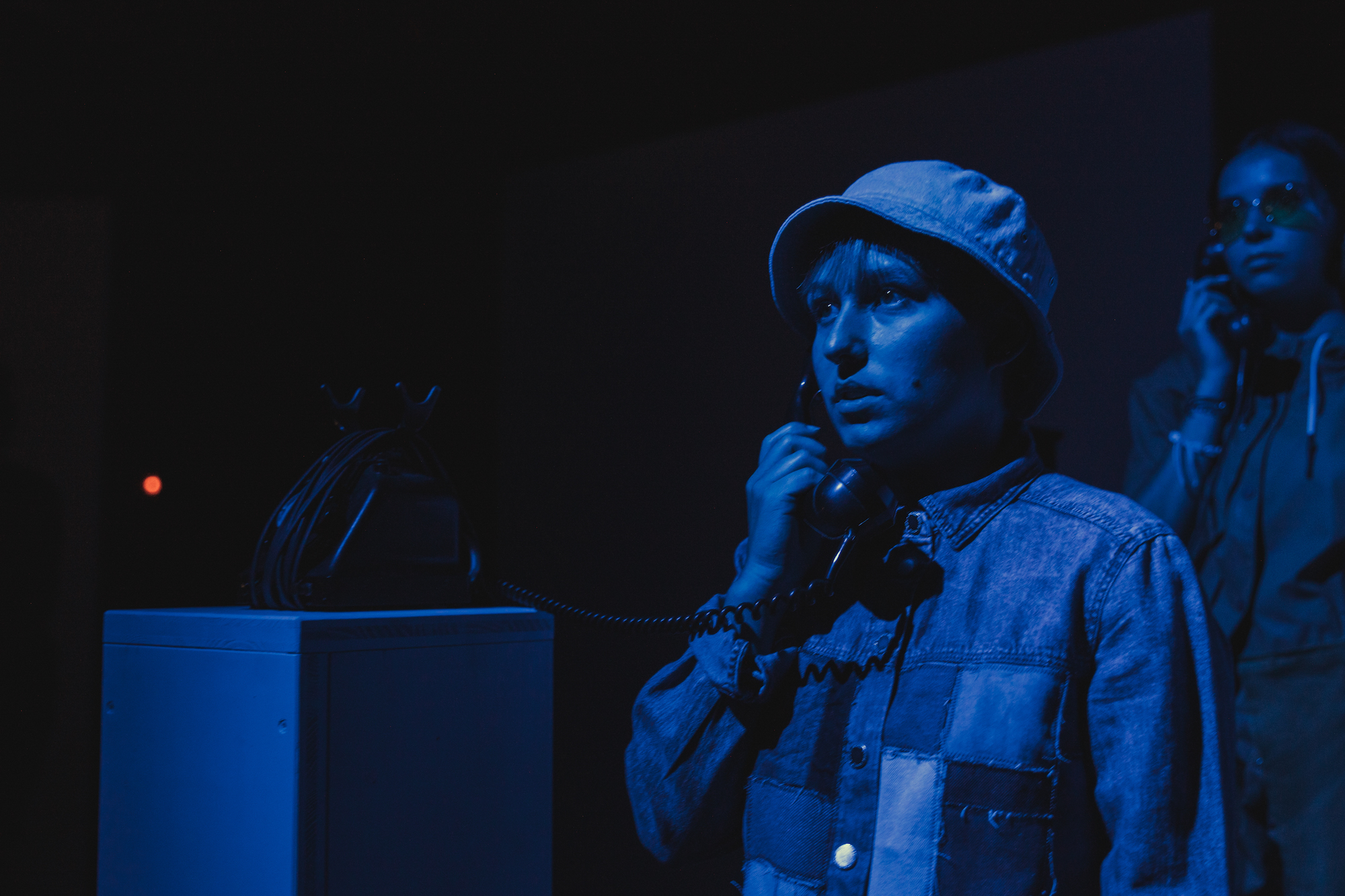 Da stehen alle an diesen Stelen, die immer wieder als multifunktionale Bühnenelemente hin und her geschoben werden, alle ein Telefon neben sich, über das sie Maries Kopf bespielen, ihre Kakophonie in ihn hineinballern. In solchen Momenten changiert das Licht ganz fein, wirkt mehr, als dass es bewusst wahrgenommen wird.