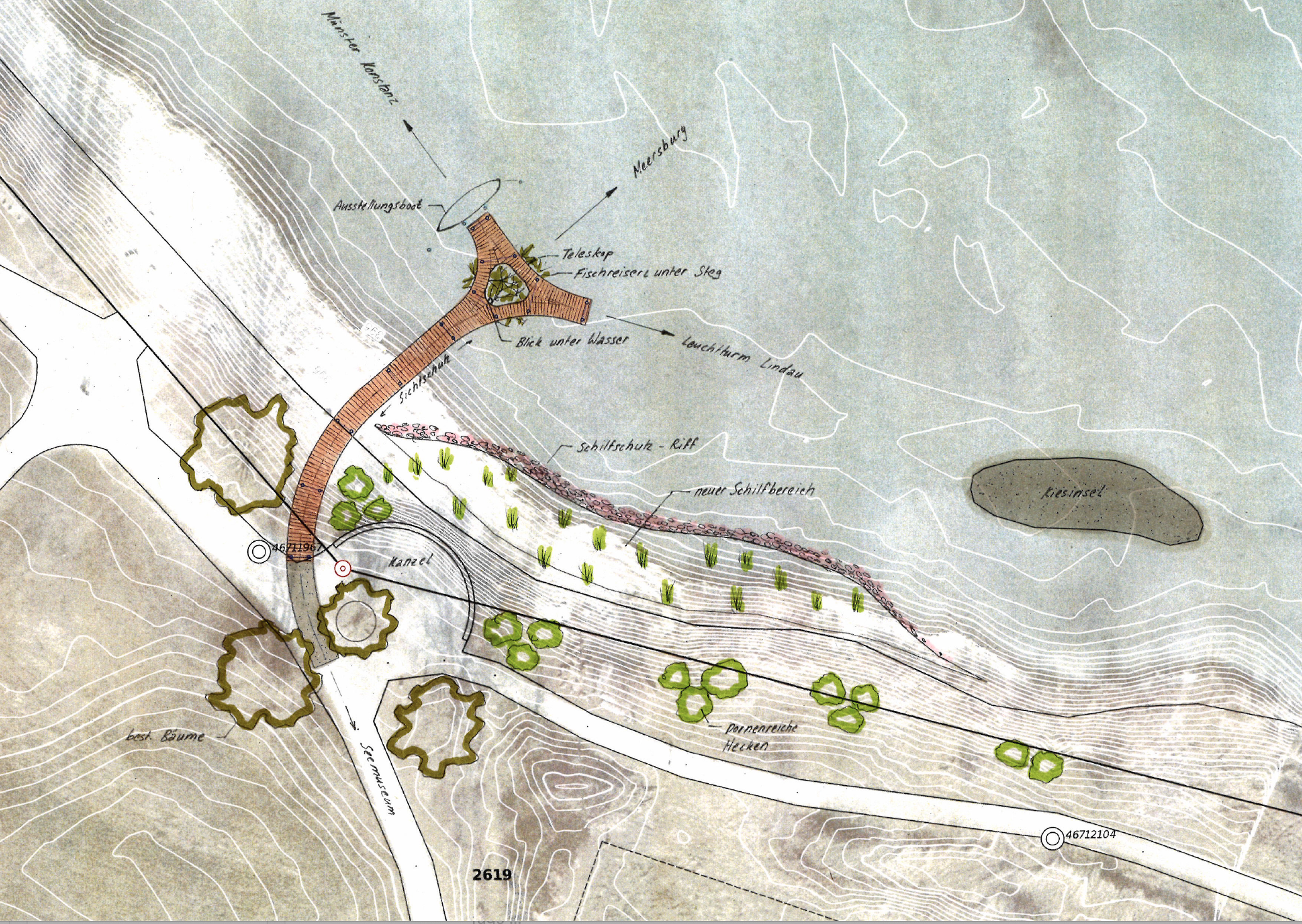 Das See-Burgtheater hatte gebeten, den Standort ein wenig nach Osten zu verschieben, um mit der Bühne nicht in Konflikt zu kommen. Den Bedenken der Vogelschützer wird Rechnung getragen, indem auf dem Steg in Richtung des Schilfgürtels im benachbarten Naturschutzgebiet eine Sichtschutzwand angebracht wird.