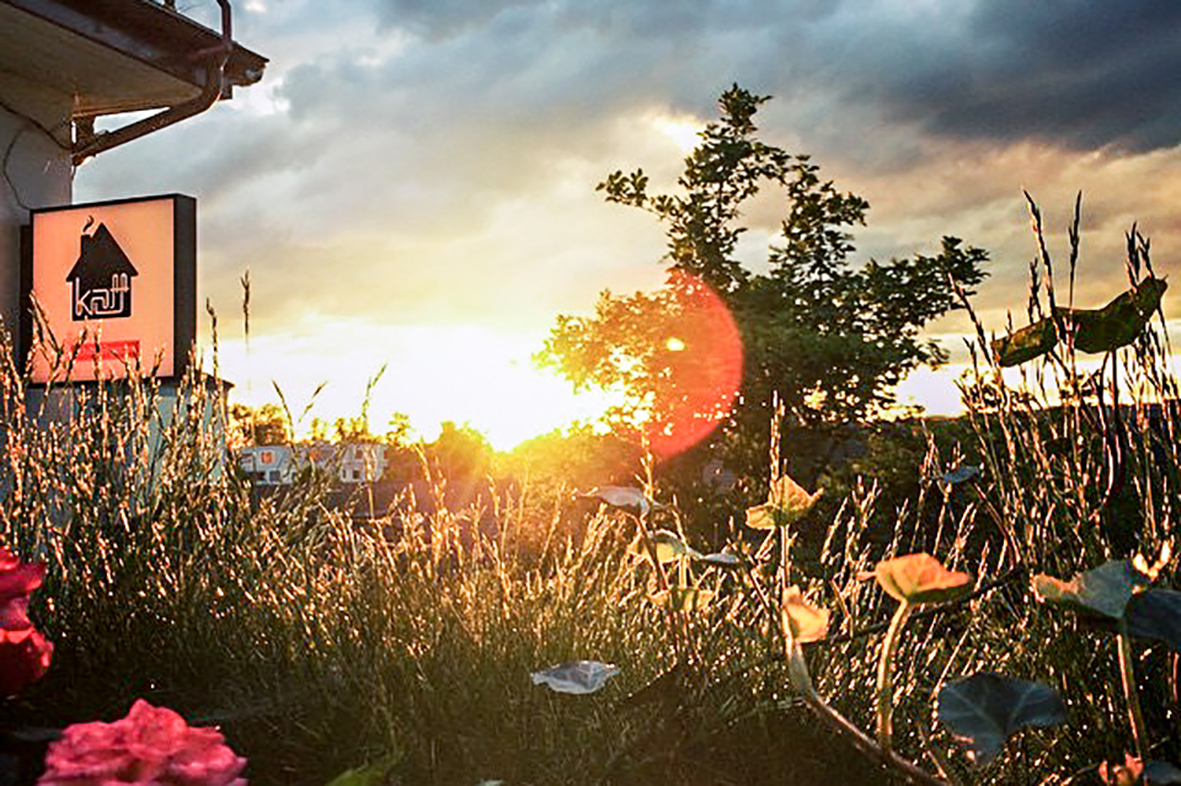 Blick vom Café "Käptn" auf der KAFF-Terrasse in den Sonnenuntergang.