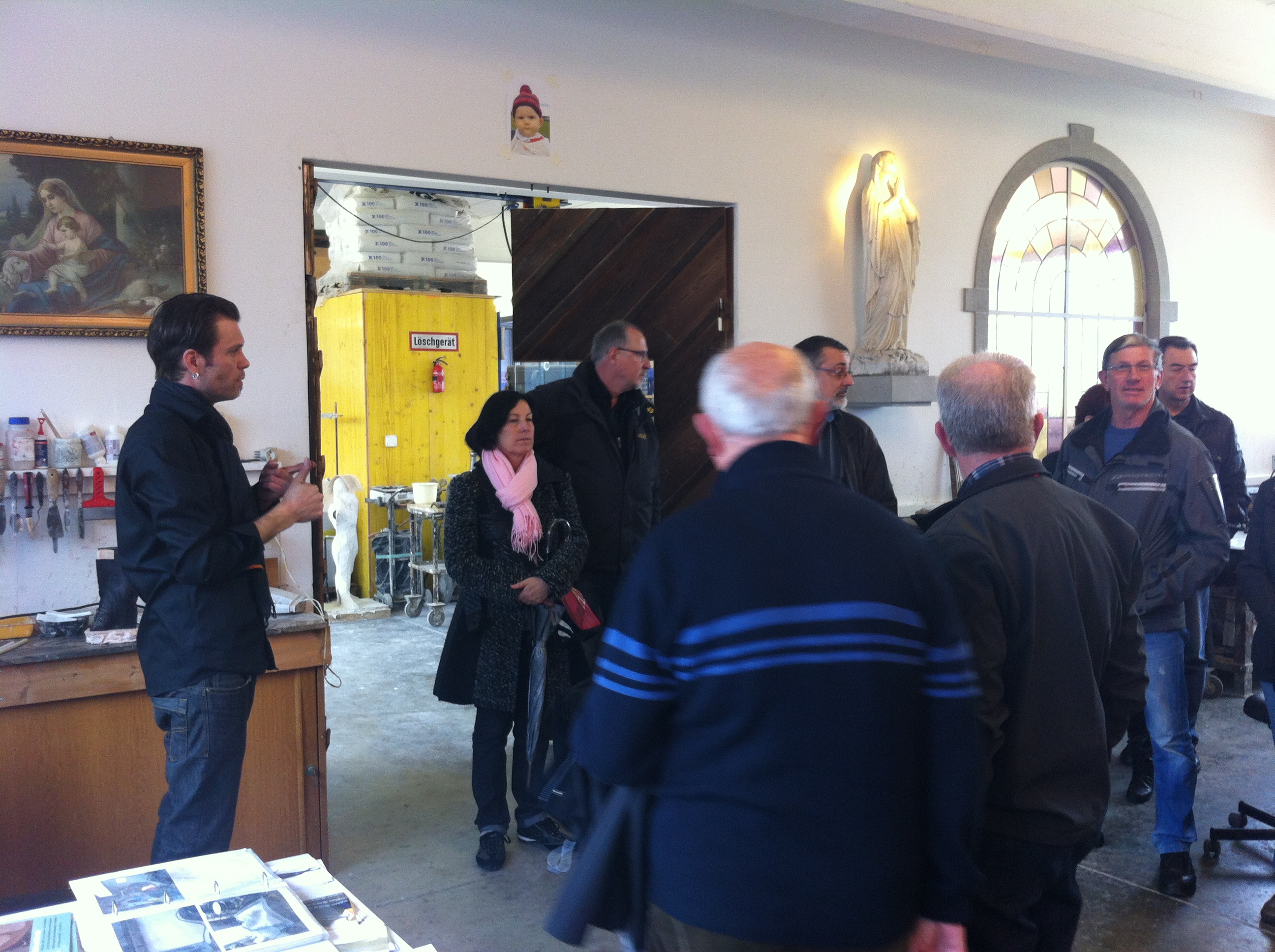 Steinbildhauer und Kunstgiesser Cornel Hutter erläutert den zahlreichen Interessierten die 24 Schritte vom Rohling bis zum fertigen Bronzeobjekt.