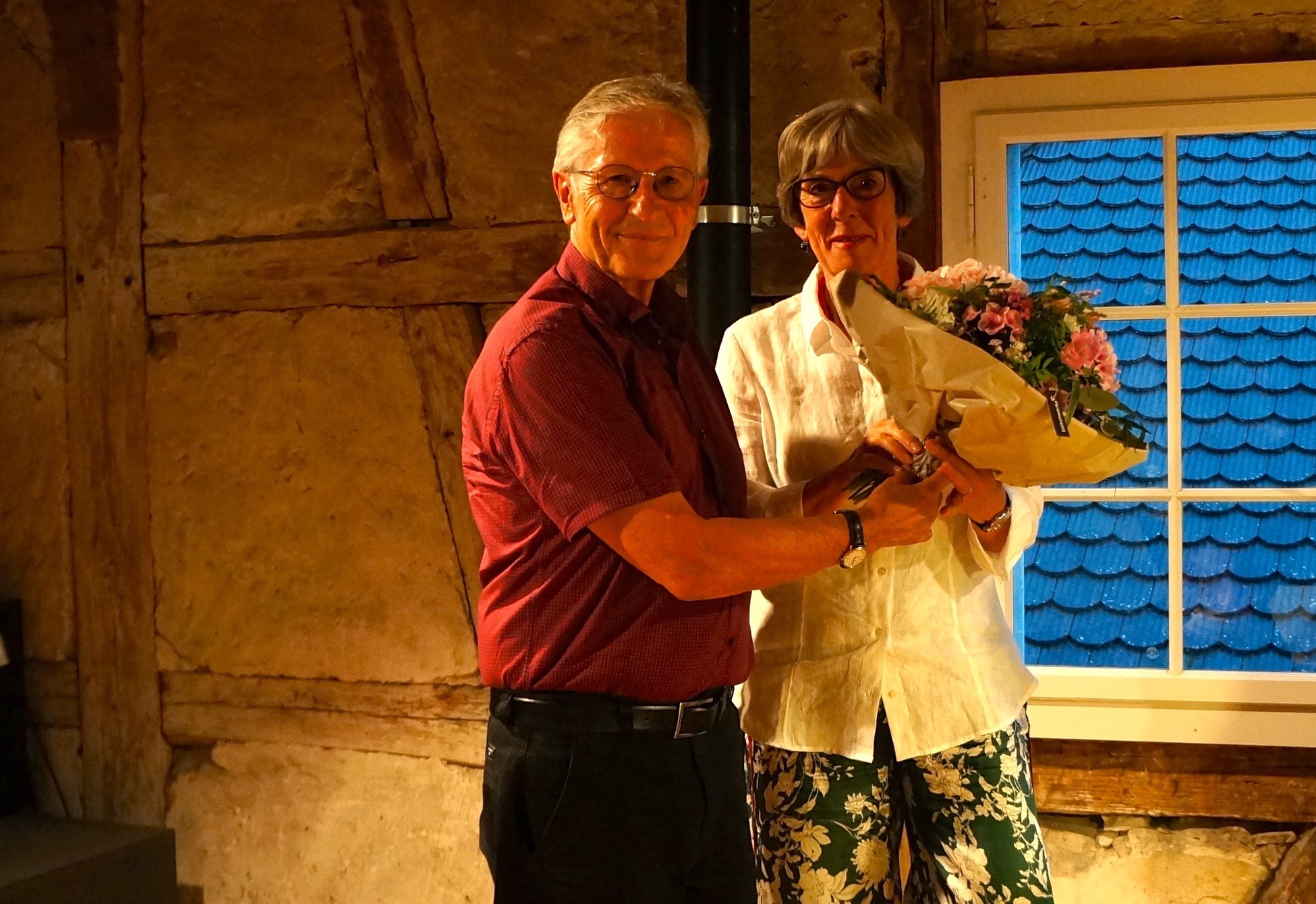 Claudius Graf-Schelling, der Präsident des Stiftungsrats der Bodman-Stiftung bedankt sich bei Kathrin Zellweger nach ihrer letzten Moderation als Programmleiterin. Bild: Inka Grabowsky