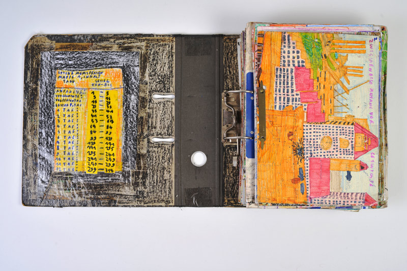 Wichtiger Bestandteil der imaginären Welt von Michael Golz ist eine Serie von Ordnern, die der Künstler als Ifichen Mem’s Ferien Mappen bezeichnet. Darin erzählt er in Bildergeschichten von Ereignissen und Reisen durch Athosland, das bevölkert ist mit fremdartigen Lebewesen. Da tummeln sich neben den Ifichen zum Beispiel Ängstlichenzähne, Brucktiere, Putzviecher, Autobahn-Schlangen oder Ziehdinger, die allerlei nettere oder garstigere Eigenschaften aufweisen. Für diese Erzählungen hat Michael Golz im Verlauf der Jahre ein ganz eigenes Idiom, die «Ifichensprache», entwickelt. Diese frei erfundene Lautsprache ahmt Geräusche nach und zeugt von grosser Kreativität, von Erzähllust und einer fröhlichen Missachtung mancher Sprachkonventionen, die seine Ausführungen bis hin zur Unverständlichkeit führen.