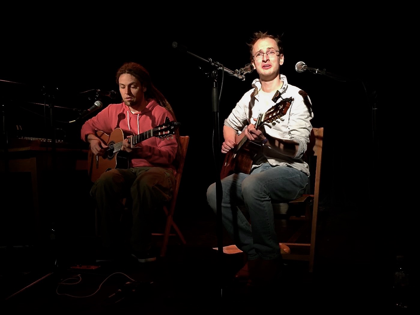 Die Musik von Simon Eickhoff und Jan Traphan erinnert an Simon & Garfunkel, aber auch an das legendäre Bonner Liedermacher-Duo Joint Venture. Die beiden Gitarren umspielen sich genau so hübsch, wie die Gesangsstimmen der beiden. Mit Hilfe eines Loop-Gerätes lassen die beiden mehrstimmige Chor-Gesänge entstehen, die weinende Babys zum Schlafen bringen könnten. Wären da nur nicht diese Texte.