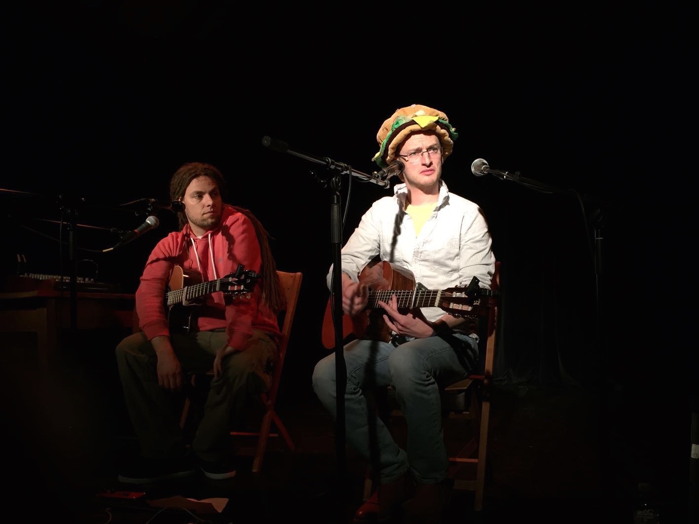 Mit dem Burger auf dem Kopf liebliche Melodien zupfen und Gotteslästerung betreiben: Simon & Jan kennen wenig Anstandsgrenzen.