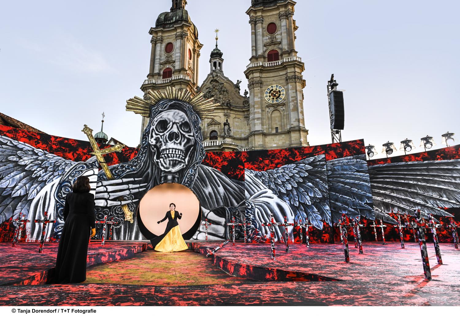 Darum (und sowieso) kommt heute niemand darum herum, Oper über den kulinarischen Genuss hinaus auf ihre Gegenwartstauglichkeit zu befragen. Wer diesen Trovatore auf die Bühne stemmt, erst recht auf die exponierte St.Galler Festspielbühne, muss wissen, warum. Die St.Galler Inszenierung von Aron Stiehl schickt allerdings widersprüchliche Signale in den Nachthimmel über dem Klosterplatz.