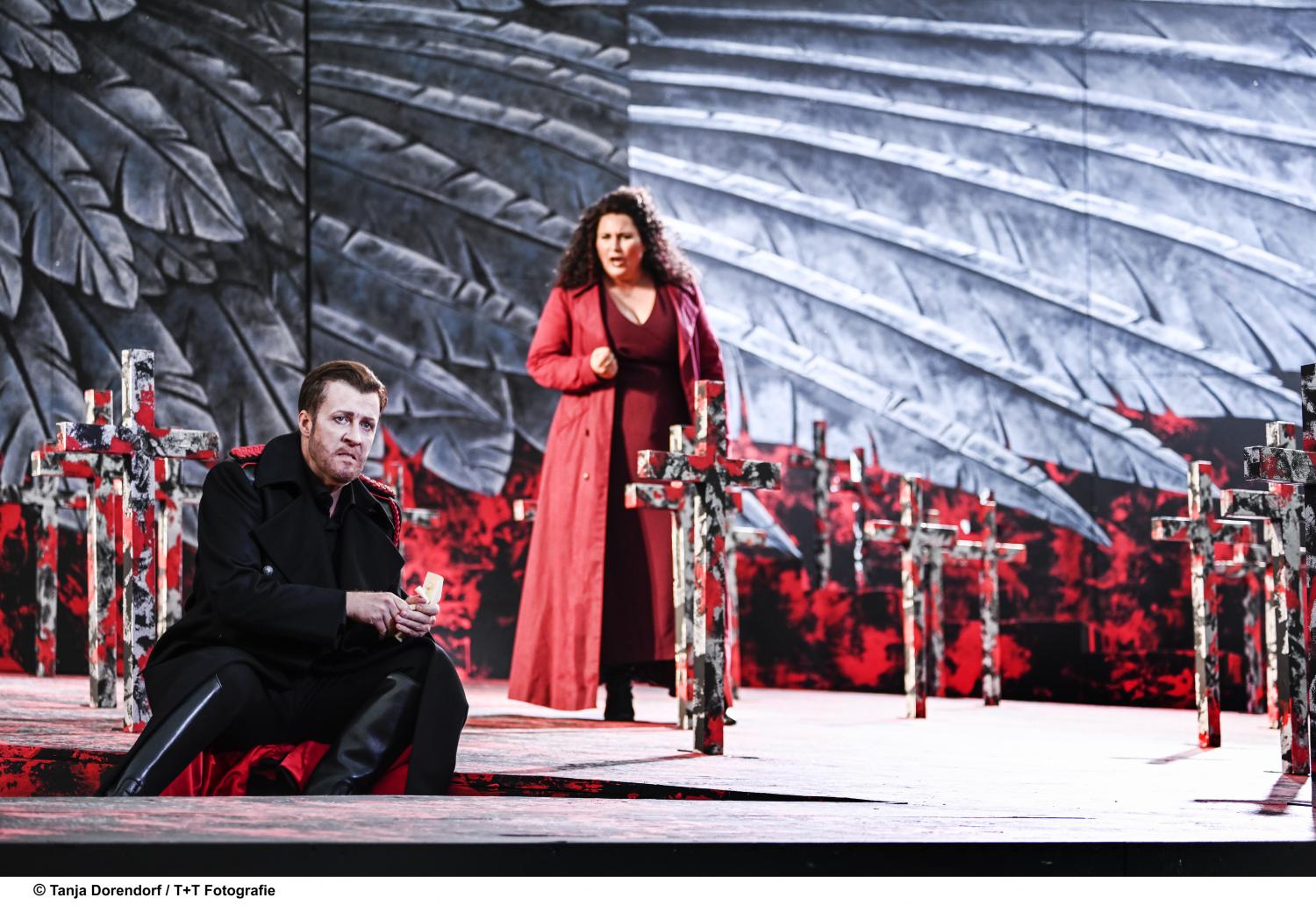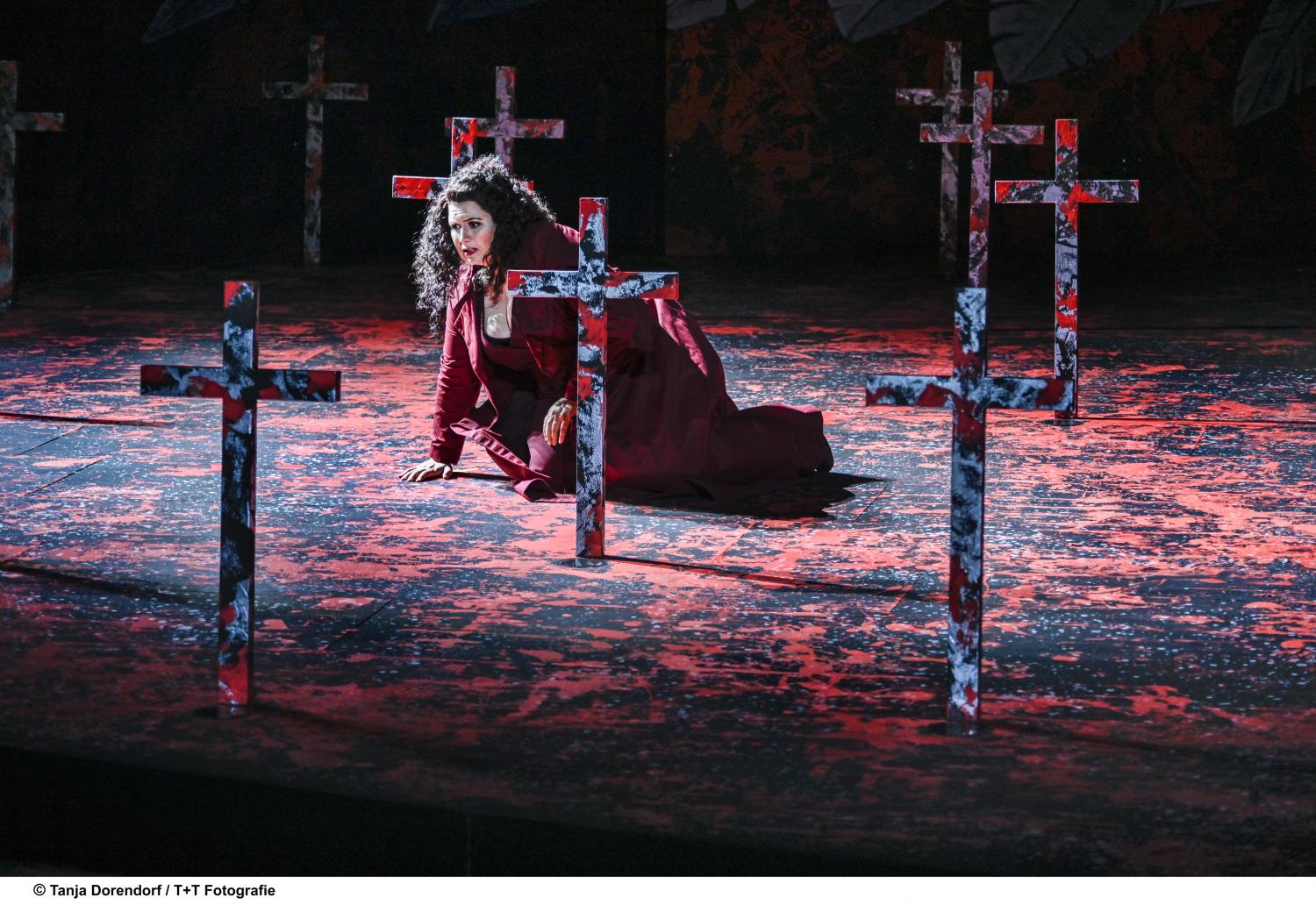 Das passt zur Mutter-Tragödie, welche diese Oper in ihrem furchtbaren Kern ist («quale orror!» singt Manrico), gibt ihr aber einen religiösen Drall, der mehr der Kathedrale im Hintergrund als dem Opernstoff geschuldet ist – am Beginn der Tragödie steht historisch ebendiese Kirche, die es zulässt oder gutheisst, dass eine Angehörige der Roma, die Mutter Azucenas, als Hexe verbrannt wird.