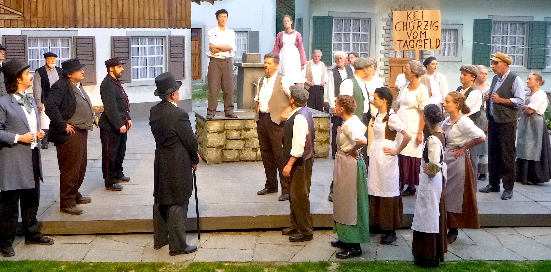 Gegen acht ertönt eine Dampfsirene. Zwischen fröhlich spielenden Kindern und Stickern, die aus ihren Häusern treten, geht das Publikum zur Tribüne. Da ist ein Platz, dahinter stehen drei Häuser, in denen die Heimsticker wohnen. Zuerst erscheint Traugott Steiner, den dier Zuschauer sofort ins Herz schliessen. Der listige Alte sucht immer wieder ein neues Versteck für seine Schnapsflasche und hat die Lacher auf seiner Seite, wenn seine Frau Martha ihm auf die Schliche kommt. „Das sind mini Härdöpfel“, sagt er mit Blick auf die Flasche zum Gemeindepräsidenten, als dieser einen Jungen verfolgt, der einen Sack Kartoffeln gestohlen hat.