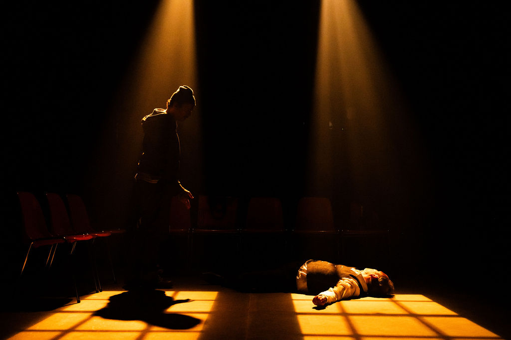 Das Lichtdesign von Marco Oliani schafft eine Seelenlandschaft, in der Thomas (Federico Dimitri, stehend) und Viktor (Noce Noseda, am Boden) auf die Suche nach sich selbst gehen. Bild: Regina Jäger
