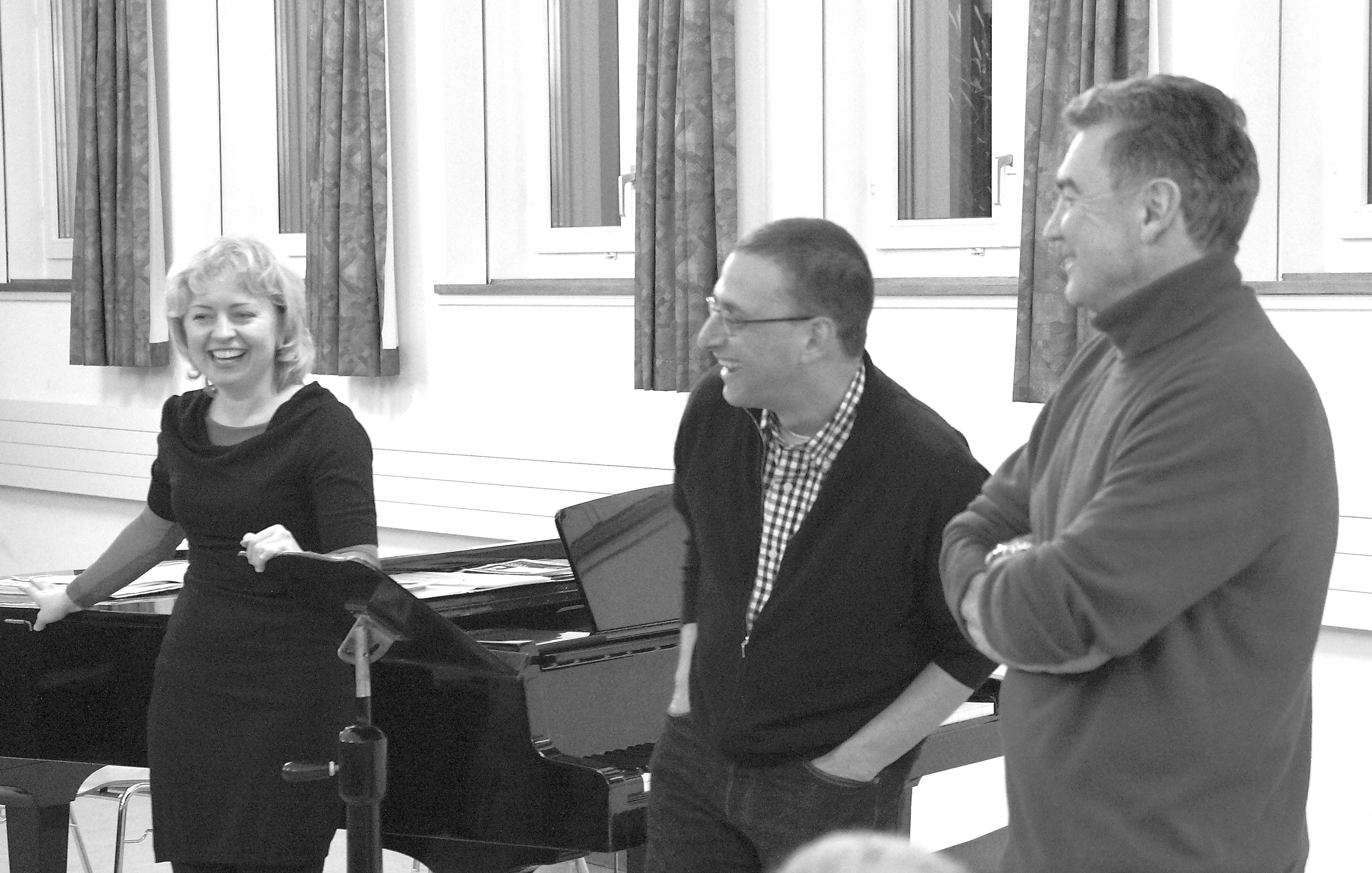 Heute bei der ersten Probe mit der berühmten Gast-Dirigentin geht es darum, sich gegenseitig kennenzulernen. Anna Skrileva hat damit keine Probleme: „Guten Abend, Jungs“, begrüsst sie die Herren. „Herr Biegert hat uns gut trainiert“, sagt Peter Dransfeld. „Ich hoffe, dass wir wenigstens ungefähr Ihren Erwartungen entsprechen.“ Offensichtlich sieht die Künstlerin aber noch ein paar Baustellen. Alle paar Takte unterbricht sie den „Jägerchor“ aus dem Freischütz. Mal stimmen die Akzente nicht, dann die Artikulation, dann fordert sie mehr Temperament. „Sie müssen noch virtuoser werden“ fordert sie. „Ich weiss aus meiner Erfahrung, dass sich beim Jägerchor die Hörner präsentieren müssen“, erklärt sie. „Und deshalb müssen Sie Ihr Tempo den Hörnern anpassen und nicht umgekehrt. Es darf nie bequem für Sie sein! Ich spiele es mal kurz vor“. Sagt’s und schiebt Claus Gunter Biegert vom Klavierhocker. Er nimmt es gelassen und stellt sich vor seine Sänger: „Ich bin schuld“, bekennt er. „Ich habe ihnen gesagt, dass sie es so singen sollen“. „Und dann kommt die Dirigentin und macht alles anders“, beendet Anna Skryleva den Satz lachend.