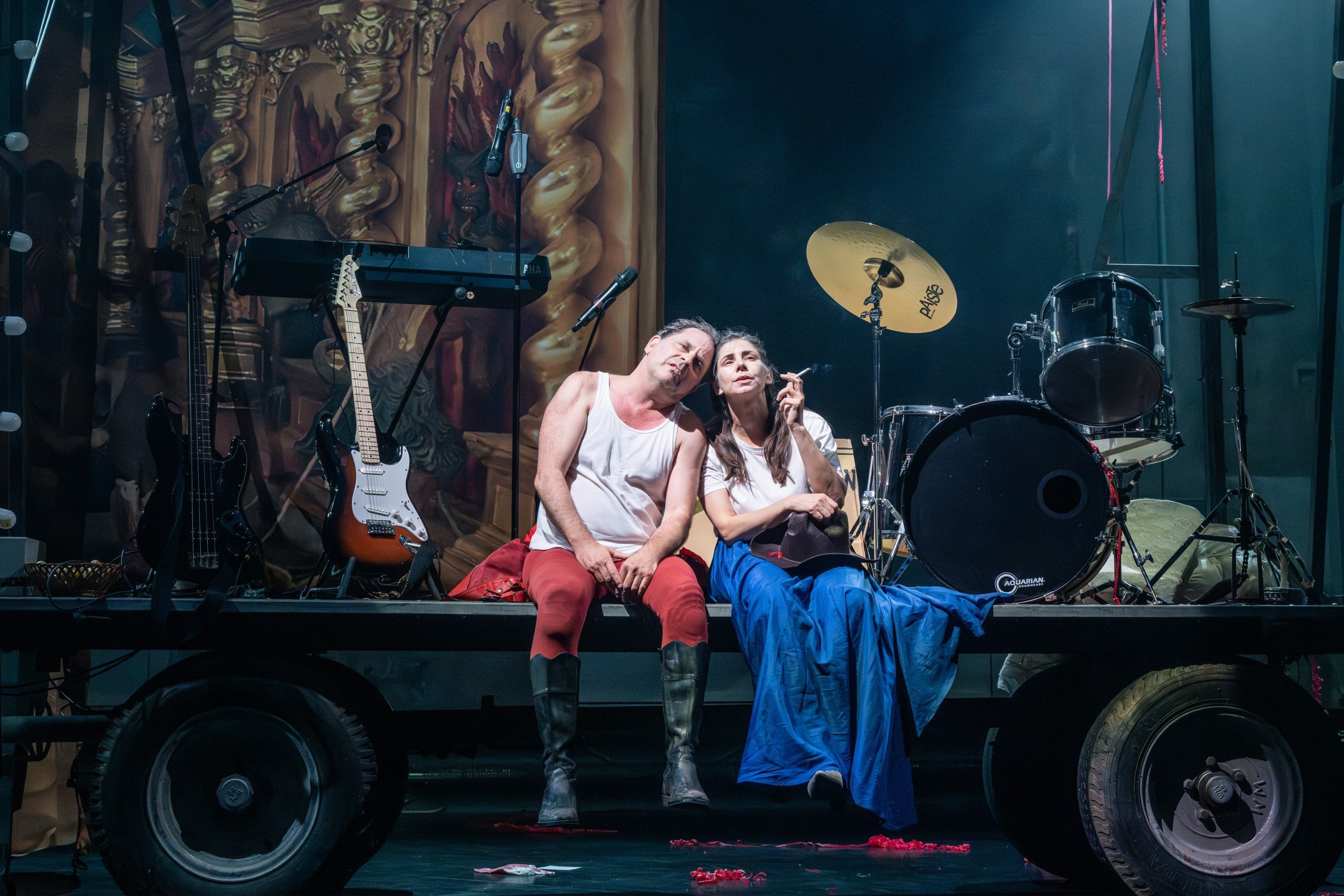 Einen komischen Höhepunkt erreicht das Stück bei Tylls Roadshow. Auf einem Bühnenwagen spielt eine illustre Band Songs wie The Sound of Silence oder Should I Stay or Should I Go. Ein Kopf rollt davon und ein langer Strumpfhosenpenis schleift über den Boden. Die Szene gipfelt in einer Kliby-und-Caroline-Nummer; das Publikum ist ausser sich. Es ist vielleicht genau die Menge an Derbheit, die es braucht, um Krieg ertragen zu können.