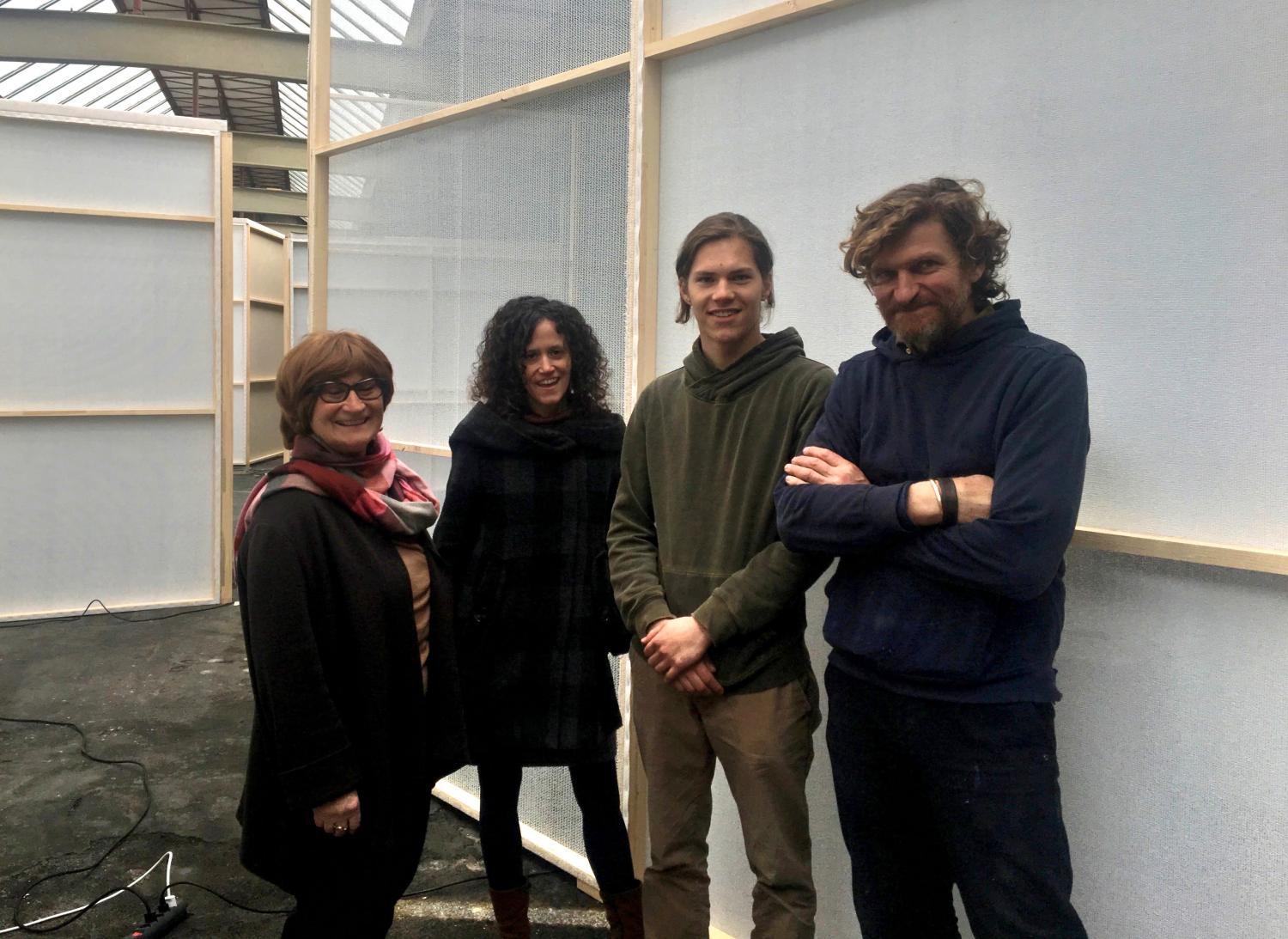 Daniel Robert Hunziker und sein Assistent Fiore Meron sind beim Betreten der Kunsthalle hinter den aus Holzlatten und weissen Netzen gefertigten Wänden zuerst gar nicht zu sehen. Die von ihnen geschaffene Konstruktion ist eine Art Mischwesen zwischen Architektur, Skulptur und Multimedia-Installation. Geräusche von Hämmern und Bostitch-Pistole lassen vermuten, dass emsig gebaut wird. Die Vorstandspräsidentin Inge Abegglen und die Kuratorin Deborah Keller schwärmen davon, wie spannend es sei, der Entstehung eines neuen Raumes zuzusehen. Vor zwei Wochen war die Halle noch leer, und jetzt steht hier diese gleichsam transparente und schleierhafte Struktur.