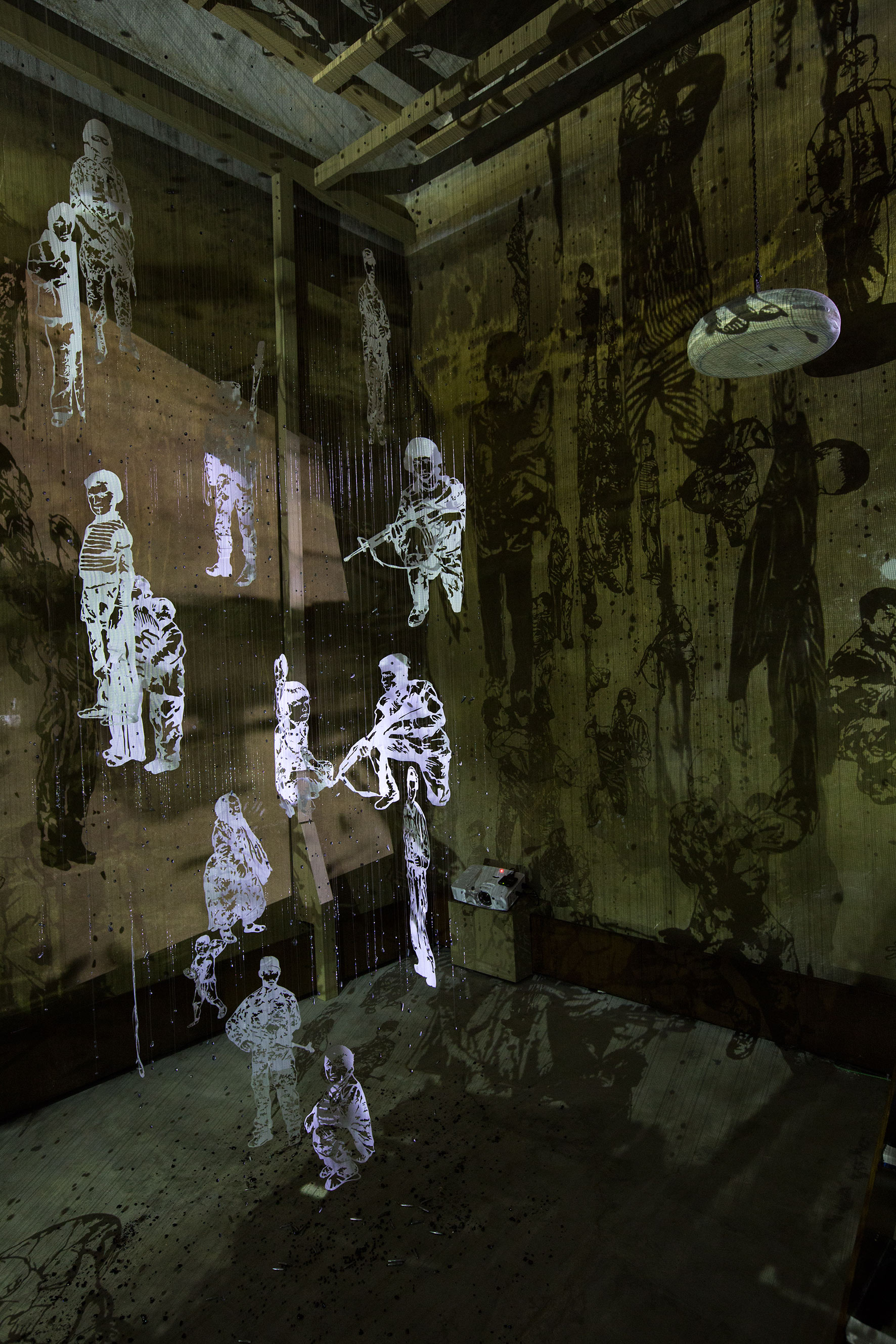 Über ein paar Stufen gelangt man in diesen fast ätherisch wirkenden Ort. Von der Decke baumeln raumhohe, riesige Mobiles aus Scherenschnitten. Sie zeigen Soldaten, Familien, die fliehen, Kinder, die flehen und das ganze Drama, das so ein gesellschaftlicher Umschwung mit sich bringt. Leid, Schmerz, Mut, am Ende aber auch Desillusion. Die Figuren drehen sich im Kreis, es geht nicht weiter, Fortschritt ist hier nicht in Sicht. Aus den Lautsprechern tönen Klänge, die an eine Kinderspieluhr erinnern. Teresa Diehls Blick auf den arabischen Frühling ist offensichtlich sehr nüchtern. Vielleicht auch deshalb ist diese Arbeit die eigentliche Herzkammer der drei ausgestellten Werke. Die ziselierte Handwerkskunst der Scherenschnitte, die sich umeinander drehenden Figuren, die keinen Ausweg aus dem Dilemma, aus ihrem Leid finden, die Vergrösserung dieser Idee als schwarze Schatten auf der Speicherwand, die Tonspur mit Kindermelodie, die ohne Umwege direkt ins Herz des Betrachters zielt, all das ist bis ins grausame Detail (auf dem Boden unter den Mobiles liegen Schrapnellspuren neben abgebrochenen Schrauben) so perfekt inszeniert, dass man Stunden an diesem Ort verbringen könnte, und immer noch etwas Neues entdecken würde.