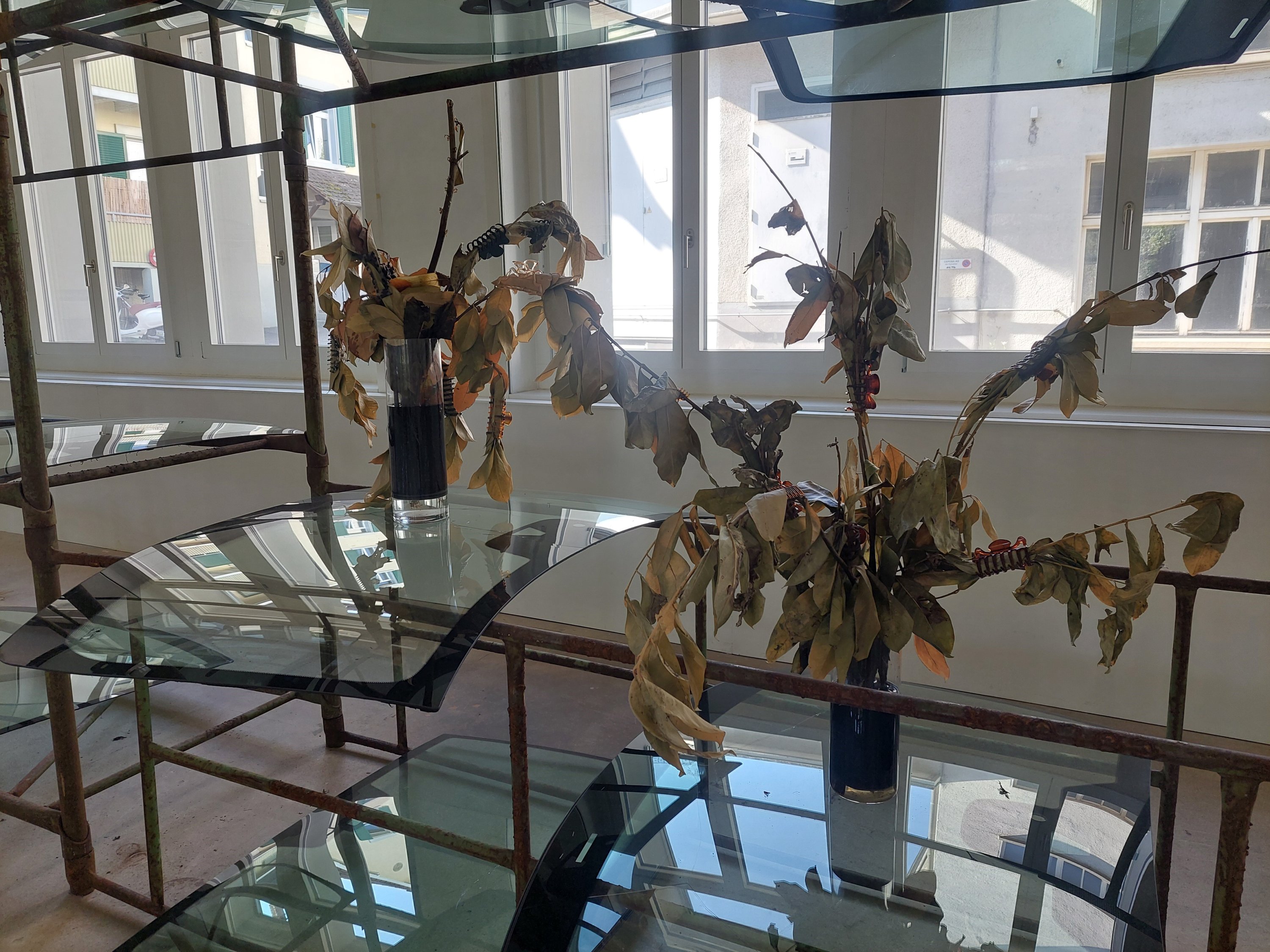Dominiert wird der Hauptausstellungsraum im Kunstraum Kreuzlingen jedoch von einer riesigen Installation aus Windschutzscheiben und Baugerüsten vom Künstlerpaar Idle Hands. Rund 20 mehr oder weniger beschädigte Windschutzscheiben liegen nutzlos und wertlos auf zwei Baugerüsten. Waren sie, eingebaut im Auto, als Schutz des Menschen vor der Umwelt nützlich und aktiv, sind sie nun fertig mit ihrem Leben – kaputt und unnütz. Ruhiggestellt ist auch der darauf platzierte Kirschlorbeer, in Vasen, die mit Erdöl gefüllt sind. Beides irritierend und zugleich Basis für Diskussionen. Wer oder was schützt eigentlich wen vor was oder wem?