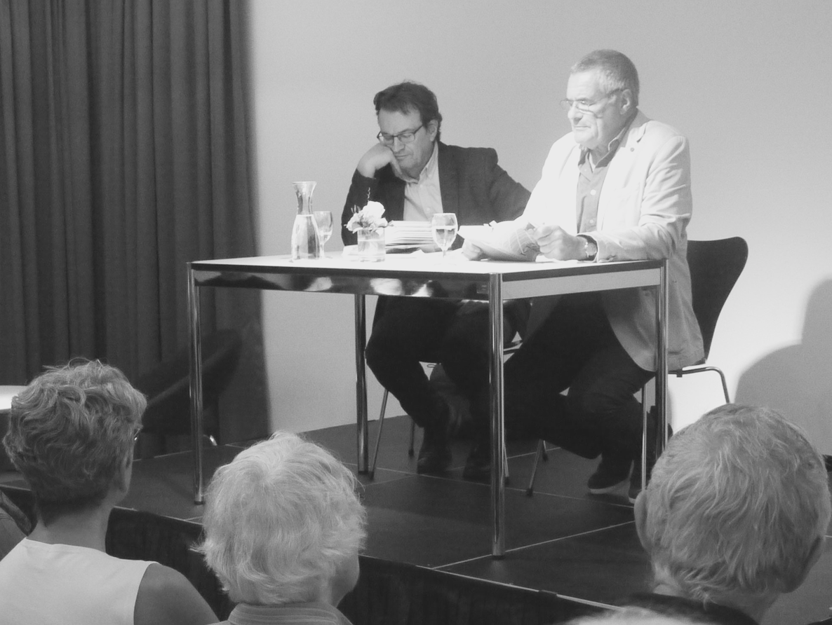 Verlagschef Erwin Künzli (Links) führt durch den Abend, während Peter Höner Teile seines neusten Romans vorliest. (Bild: Tobias Rüetschi)