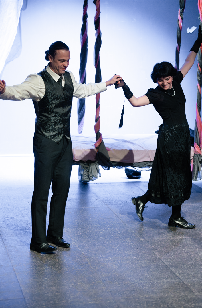 Tschebutykin ist der traurige Clown in der Inszenierung von Anton Tschechows „Drei Schwestern“ des Theaters Theagovia. Schauspielerin Patricia Venturini erinnert in ihren viel zu weiten Hosen ein bisschen an Charlie Chaplin, wie er als in die Welt Geworfener um Orientierung kämpft. Sie macht sich gut als Slapstick, der das Lebensdrama dieser Menschen auf der Bühne als Komödie enttarnt, wenn auch als absurde. Für die anwesenden Menschen ist es allerdings egal, ob alles eine Illusion oder real ist. So oder so verpassen sie das Leben.