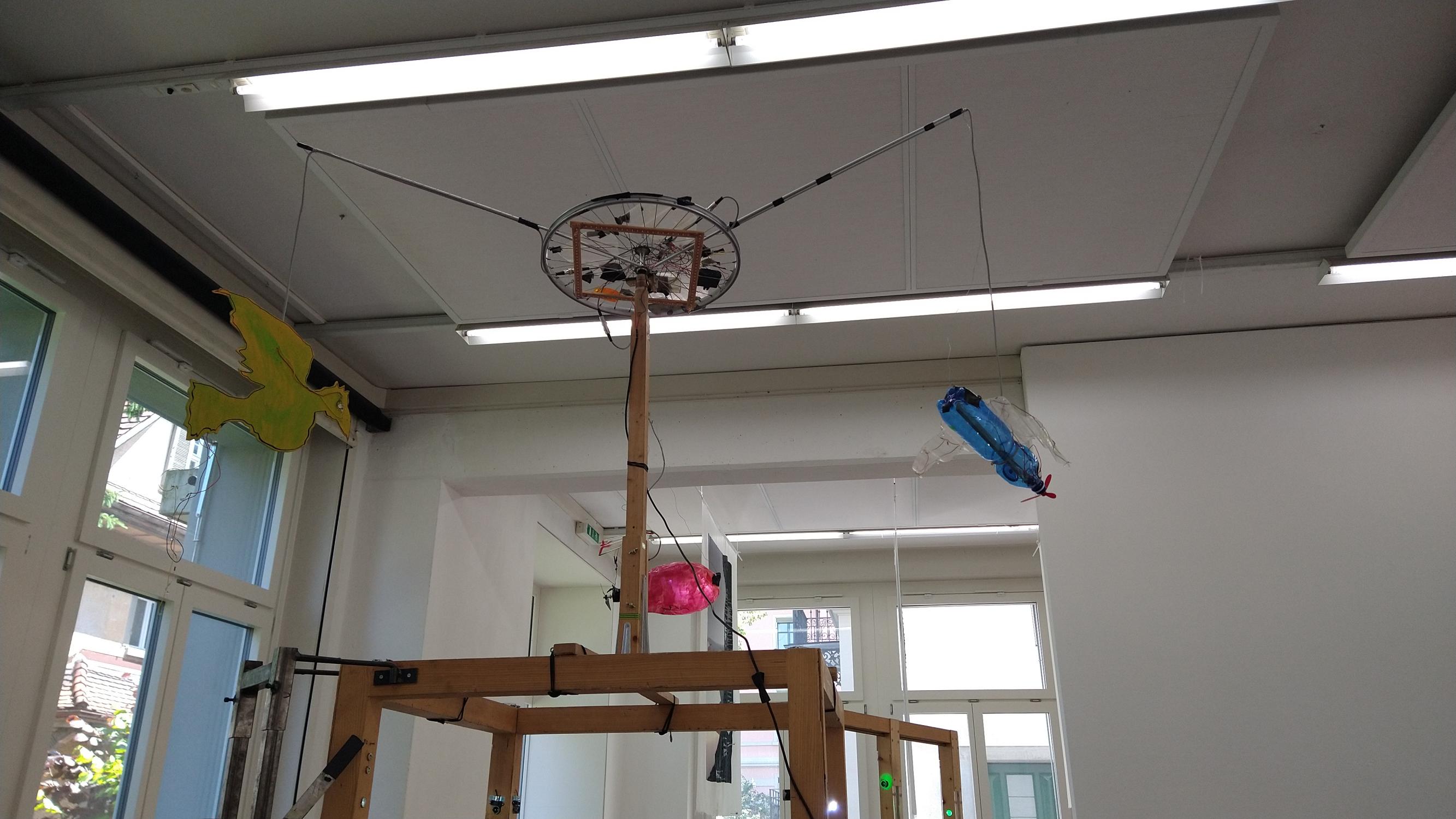 Besonders präsent ist die interaktive Maschine des Kollektivs „The Sporthorses And The Guggenheim Box". Ein wilder Aufbau aus Baulatten, Spielzeug und Atelierfundstücken, gekoppelt an ein unwiderstehlich analoges Geflecht aus Kabeln, Kanülen und Geräten. Der Rezipient wird dazu angehalten sich zum Akteur zu verwandeln, die Maschine durch seine schiere Anwesenheit anzuwerfen. Es rattert und scheppert und rasselt, jault und pfeift, ein unübersichtlicher DIY-Spielplatz. So ein Ding, das keinen Sinn macht und doch Sinn produziert, als perpetuummobile Kontextmaschine.