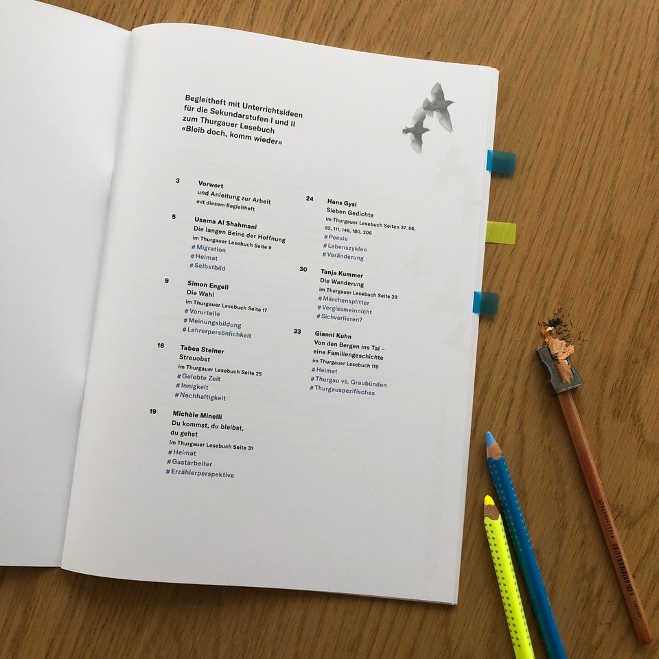 Im September erschien mit «Bleib doch — komm wieder» eine Anthologie im Frauenfelder Saatgut Verlag, der dritte Titel des noch jungen Unternehmens. Das Buch umfasst Texte von 33 Autoren und Autorinnen, die durch ihren Lebenslauf einen Thurgauer Bezug haben, und die sich in ihren Kurzgeschichten inhaltlich mit Fragen rund um Aufbrechen, Ankommen, Bleiben und Weiterziehen auseinandersetzen. Für die Anthologie ist nun auch Unterrichtsmaterial erschienen, das die Bearbeitung der Texte in den Sekundarstufen I und II ermöglicht.