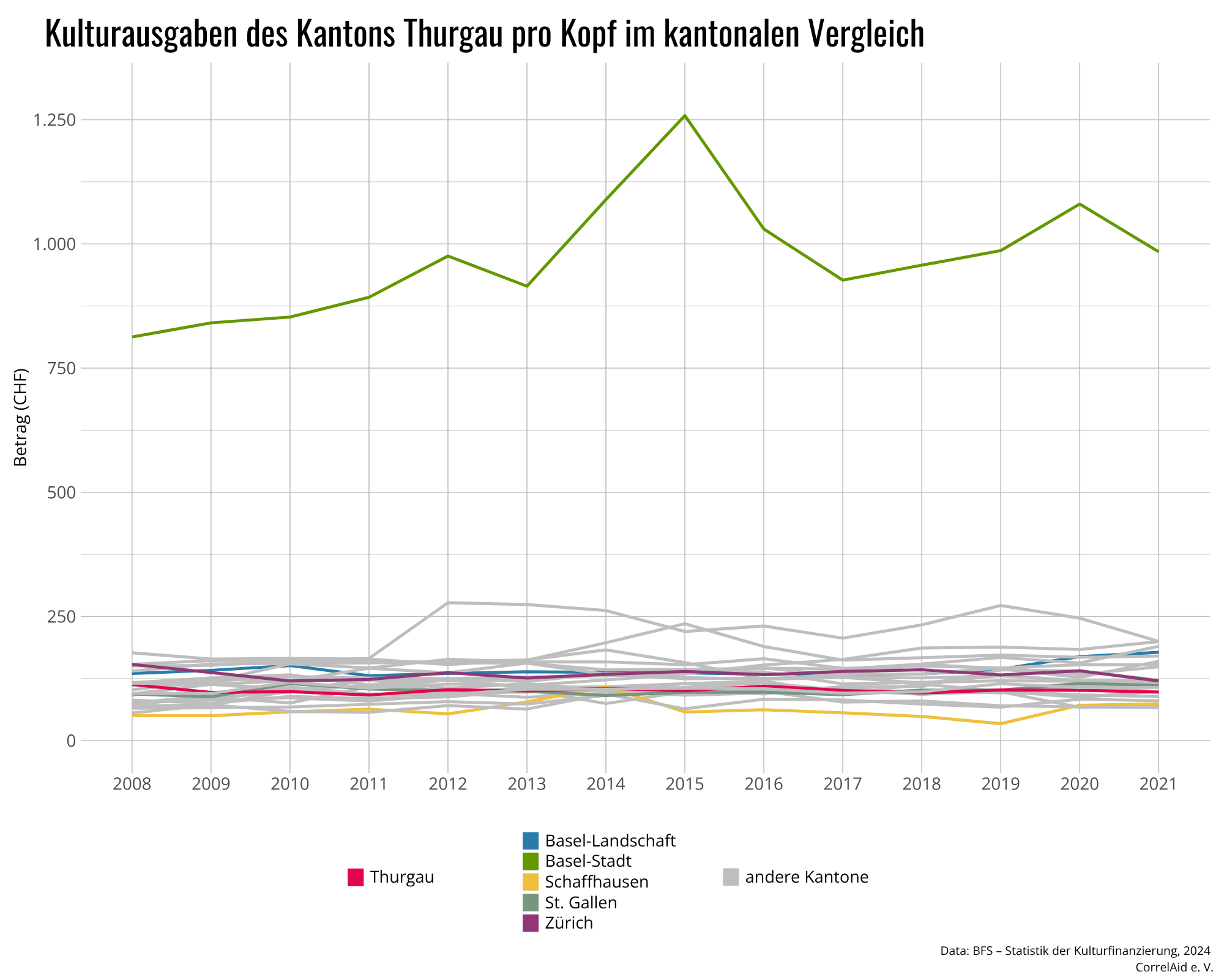 Mit 98 Franken pro Einwohner unterstützt der Thurgau seine Kultur (2021) und liegt damit in Reichweite zum Nachbarn aus St. Gallen (111 Franken). Schaffhausen berappt 74 Franken pro Kopf für sein Kulturleben. Basel-Stadt liegt in der Rangliste unangefochten vorne mit fast 984 Franken pro Einwohner. Zürich liegt bei 120 Franken pro Einwohner.