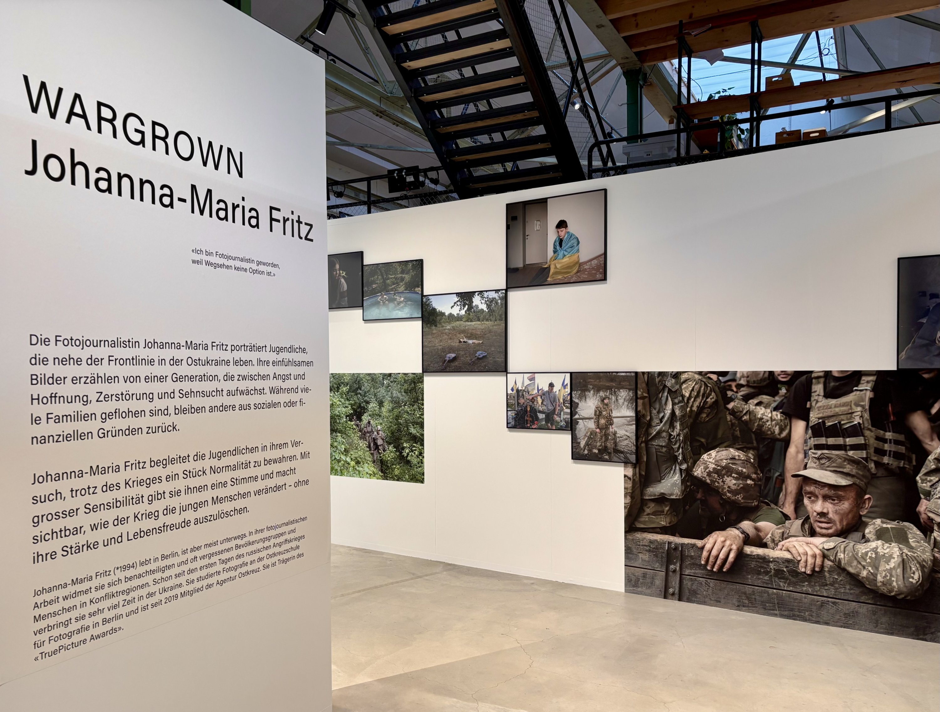 Dort, wo die Stellwände sich von violett zu weiss wandeln, beginnt das Kapitel der Kriegsfotografin Johanna-Maria Fritz. Sie dokumentiert in «Wargrown» nicht nur den Ukrainekrieg, sondern auch das Leben von Jugendlichen, die mitten im Krieg aufwachsen.