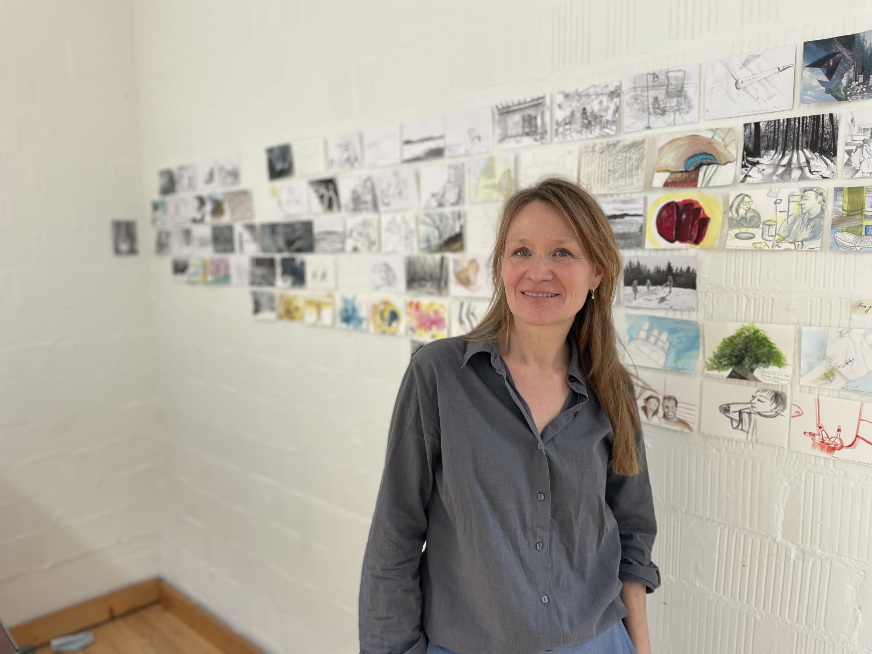 „Eigentlich wollte ich die Szenen des Videos nachzeichnen, aber ich habe bei der Arbeit gemerkt, dass das nicht stimmig ist. So kam ich auf die Idee mit den Fäden“, sagt die Künstlerin, wenn man sie auf diese Arbeit anspricht. Das zeigt ein bisschen wie Mirijam Špendov arbeitet. Sie hat oft klare Vorstellungen davon, wohin sie will, beim Weg dahin gibt sie sich aber flexibel. „Ich experimentiere viel, vieles entsteht auch aus dem Moment“, sagt die 54-Jährige. Auf einem Schreibtisch stehen Farben, Stifte und Pinsel bereit. Gerade übt sie an Aquarellen. Als Unterlage dient ihr eine alte Ausgabe des „Tagesanzeiger“.